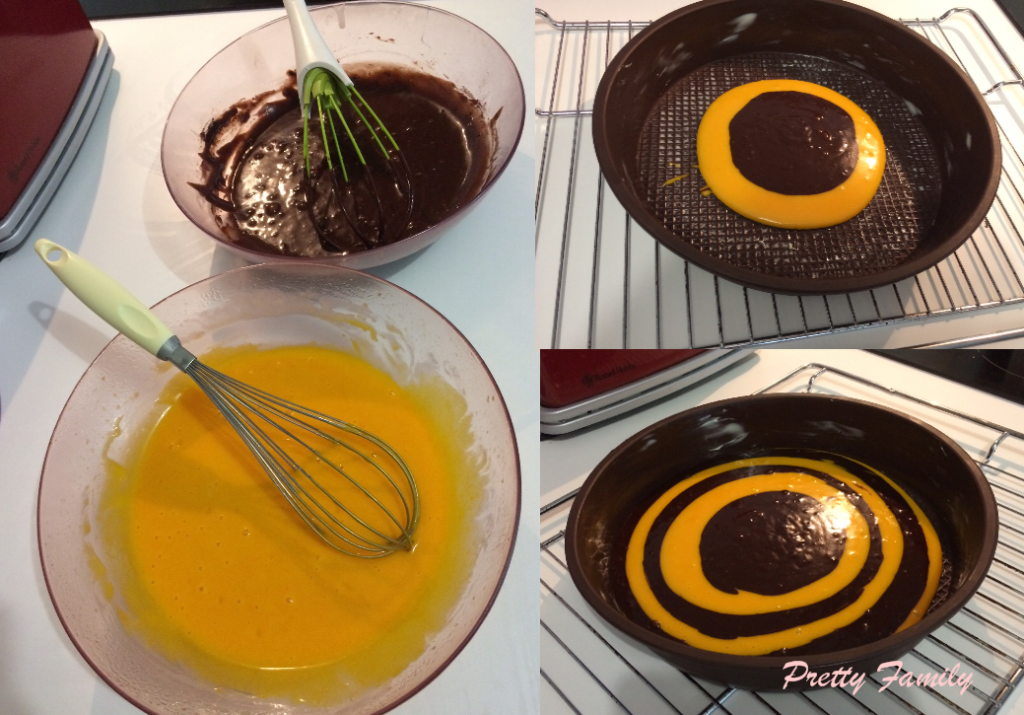 Dans le centre du moule versez alternativement trois cuillères à soupe bien remplie de chaque pâte (l’une sur l’autre) puis répétez l’opération jusqu’à épuisement des pâtes, la pâte va s’étendre toute seule petit à petit et former une cible. Enfournez 40 minutes.