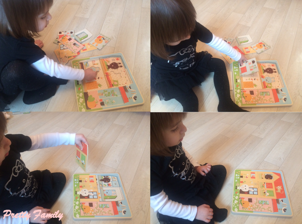 C’est un puzzle qui appartenait à Louloute, vous aurez donc du mal à le trouver de nouveau en magasin je pense. A partir de 2 ans, c’est un puzzle avec trois niveaux qui se superposent. A chaque étape, l’enfant découvre au fur et à mesure la maison des les lapins. Le principe est différent des traditionnels puzzles.