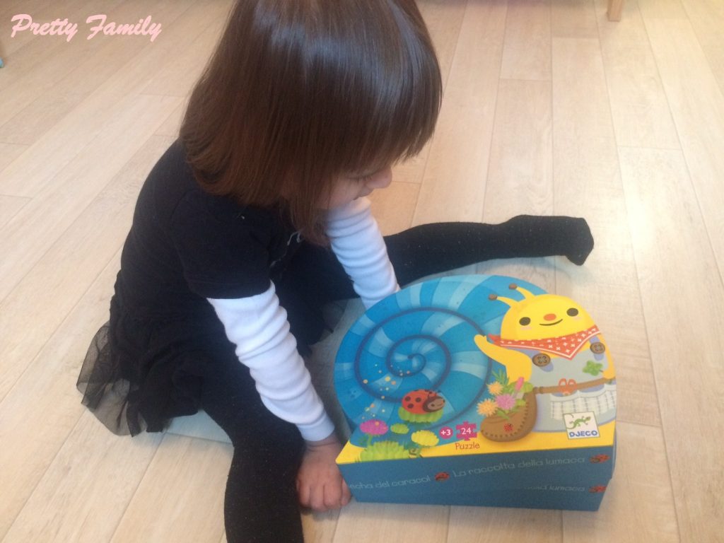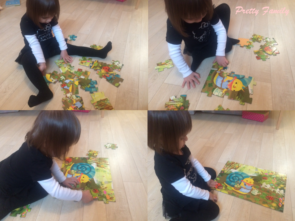 Dernier puzzle arrivé dans notre Pretty Family, cet escargot a conquis Touille. Juste la boîte est à croquer. Les couleurs de ce puzzle sont vives et attirent tout de suite l’attention de l’enfant. A partir de 3 ans, ce puzzle est composé de 24 pièces. Touille commence déjà à le maîtriser, il faut dire qu’elle passe beaucoup de temps sur les puzzles d’une manière générale.