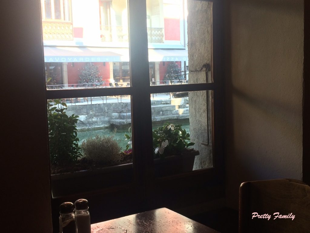 Le lendemain, samedi matin, nous décidons de rendre visite à l’agent immobilier que nous avions rencontré en août. Il souhaite de nouveau nous faire visiter une maison mais nous refusons car nous ne sommes pas sûrs que j’obtienne ma mutation. Nous ne voulons pas nous faire du mal pour rien. Nous discutons une bonne heure avec lui, il nous rassure qu’il y a souvent des maisons dans notre budget mais que ce sera au bout du lac. Plus on se rapproche d’Annecy et plus c’est cher. Nous décidons ensuite de retourner à la vieille ville d’Annecy pour déjeuner au bord du Thiou. Nous tombons sur un restaurant très sympathique, pas cher et super bon. Je vous conseille vivement d’aller chez Le Lilas Rose pour sa nourriture et la qualité du service. Après s’être restaurés, je fut rassurée car il y avait pas mal de monde dans les rues, j’avais si peur que cela soit désert.